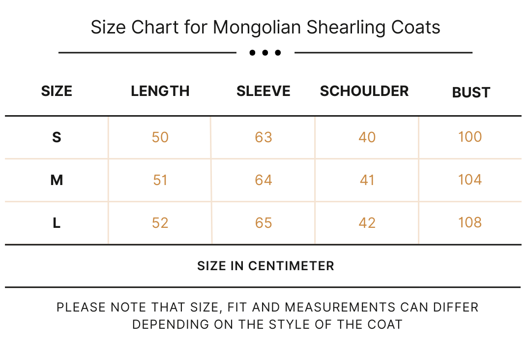 Size guide for shearling coats